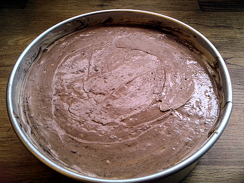 It is time to add the mix to the pan. Pour the mixture right in. Then grab your bowl of melted chocolate and pour that into the pan right on top. You are going to take a knife and slide this through the filling carefully not to nick the crust at the bottom.