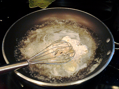 In a saute pan, get your butter melting slowly. While that is happening chop your parsley and garlic and set aside. Open the fish and get that ready just laying on plate until we set those in. You can lightly salt these. When your butter is melted, throw in the two tablespoons of flour and make your rue.