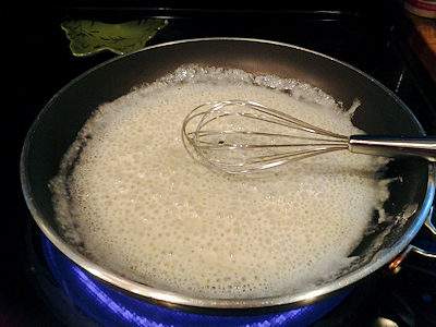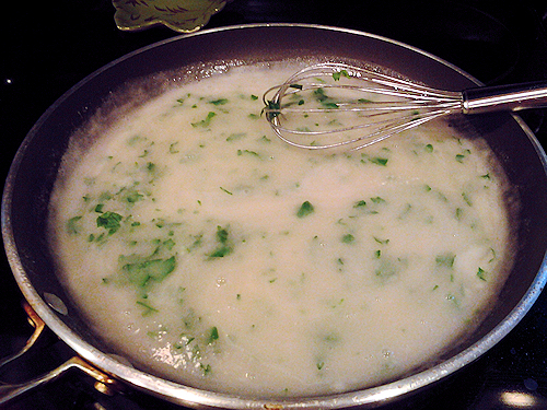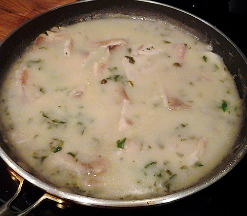 Once this is nice and bubbly and all your lumps are out, turn down the heat and let’s add your chicken stock and white wine, a toss of salt and dash of pepper, capers, half the parsley and the juice of one lemon. Let that simmer just a minute on it’s own.