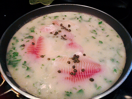 Slide the tilapia fillets right into the sauce. This will simmer on low for about 10-15minutes.