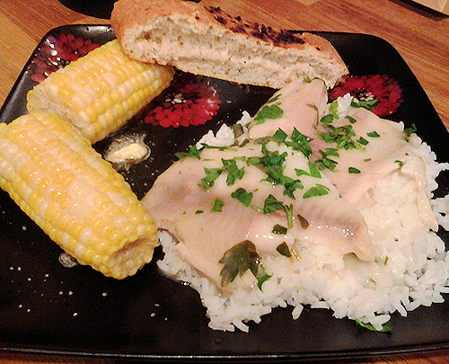 Looks a lot more beautiful in person, but trust me the taste is worth more. My little one chose the sides. She picked lemon infused white rice with parsley, a slice of warm ciabatta bread and her favorite, corn on the cob. Who am I to argue?