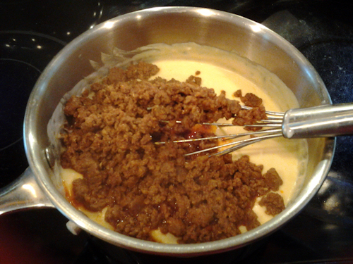 Stir again until a nice smooth consistency is achieved (this is also the same base for a wonderful mac and cheese by the way. If you were makeing that, at this point, you would add cooked elbow noodles cover the mac and cheese with some crispy panko crumbs and bake.. lol Oh my I am on a different tangent now). OK back to the dip! Where was I? Oh! Time to add the sausage. Now at this point I like to drain that sausage as much as humanly possible before putting it in the pot but if you want all that goodness dump it right in! Who am I to stop you?