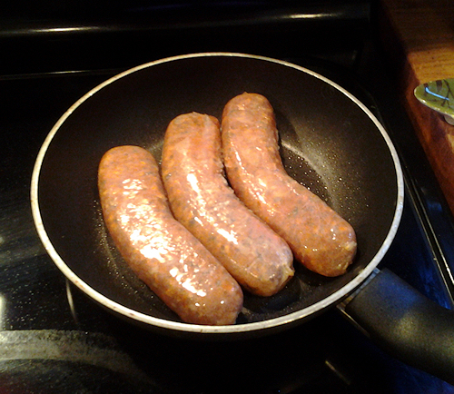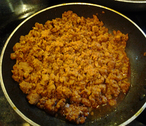 Once you get them unwrapped use a wisk and break apart the meat in the pan kind of like you would taco meat to make it nice and fine. Simmer the meat in the pan on medium heat you will not need any oil for the pan.