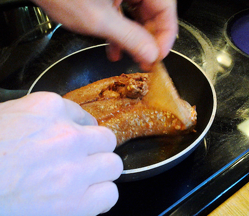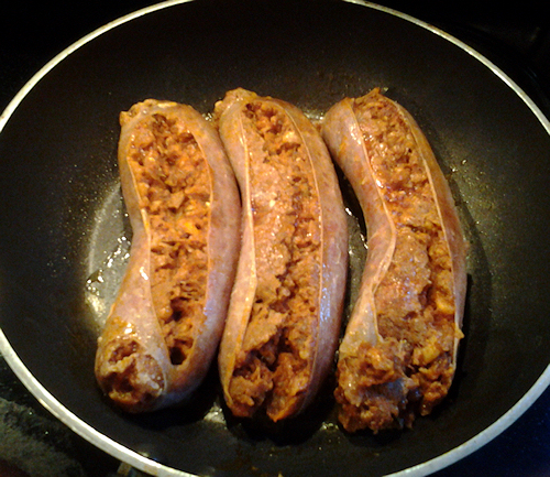 In a small sauce pan, you want to get those sausages going on medium heat. When they start to heat it will be very easy to remove the skin. Just slice down the middle with a sharp knife and pop the meat out. My hubby will show you how below….show em dear!