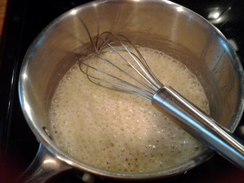 While that is simmering, get your medium size pot ready and start the rue for the sauce. Add in the 1/2 stick of butter to the sauce pot and let it melt, then add the flour and stir till smooth.