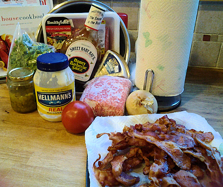 - 3 bacon strips per burger