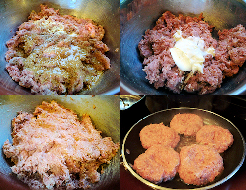 See the steps below: Sprinkle in spices, add 1 heaping Tablespoon of Mayo. Mix thoroughly and pat into patties. In the center of each patty make a ditch almost with your thumbs this will keep the burgers from getting plump and fat.