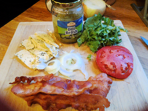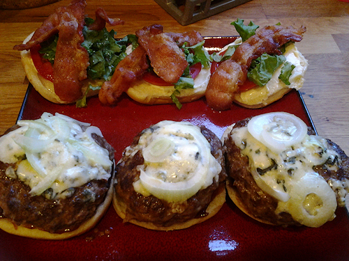 Place into pan on stove top on medium. While they are cooking lets get our condiments and our buns ready! Now I was lazy tonight so I grabbed any old bun and I didn’t even toast them! I know the horror of it all but I didn’t but I did dress them! First, let’s get that bacon, you can cook your own or buy the pre-made and microwave them a little to get them hot and crispy, I like to add three pieces per burger. Top with sliced onion, 2 nice hunks of blue cheese, a few slices of sweet pickles or a tsp of dill relish and a slathering of bar-b-que sauce, lettuce and tomato if you wish.