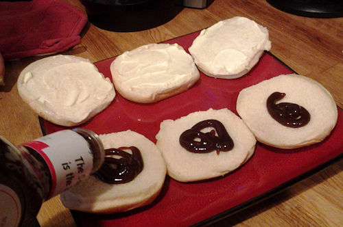 When the cheese is all melted and bubbly, it’s time to slide them onto our buns!