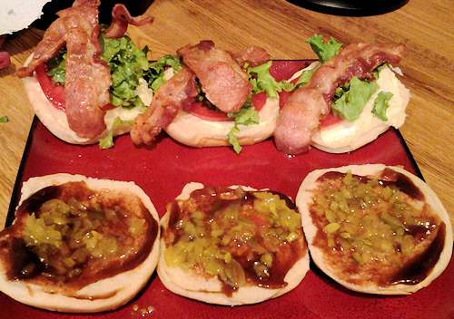 Ok, back to the buns. On one side, put a little bit of mayo and on the other a swirl of bar-b-que sauce. Now let’s pile on some more condiments…lettuce, relish (or sweet pickles) and to be truthful, sometimes I use banana peppers. They are wonderful too!!