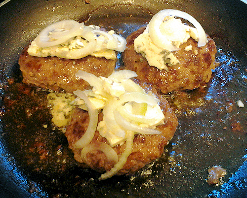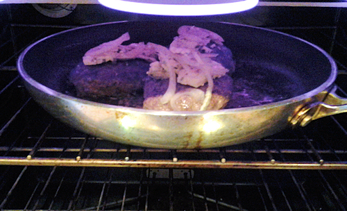 Now get some cheese and onion on those burgers!! Place blue cheese on the burgers with some of the slices of onion and place into broiler on low (use an oven safe pan for this or slide onto tin foil.