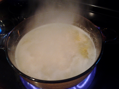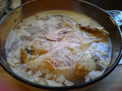 So I am skipping some pictures here because I am quite confidant you all know how to boil a chicken. You buy a whole small chicken, take it out the package , rinse and put it into boiling water with about 2 TBS salt and 1TBS pepper and 1/4 stick of real butter and boil it for about 45minutes. Now when it’s done I let it cool right there on the stove while I eat the real supper I made that night. Then after cleaning up from that nights events and I know the pot has cooled down sufficiently, I place the covered pot into the fridge over night. This not only lets the chicken get cool enough to pull apart but lets all the juices seep into every bit of that broth. When you pull this back out of the fridge the next day ( for me when I get home from work) you will see the butter solidifies to the top. That is OK!!!