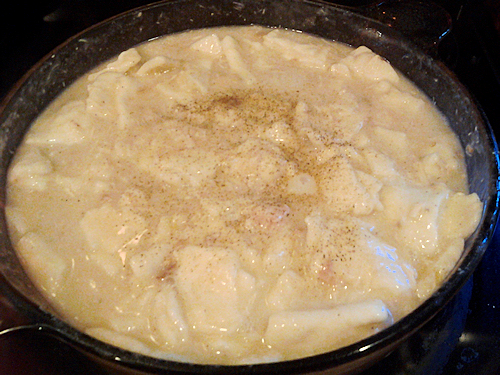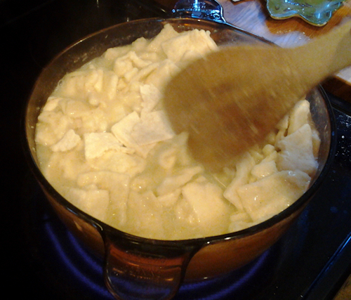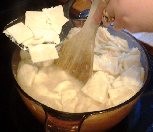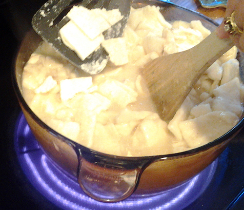 They will float and become more dense as they boil , this is where I turn down the heat a tad , stir them around a bit but not hard more like push them around. Start your next batch of dumplings. Take another third of your batch and repeat the last steps from above but this time when putting them in the pot, take a flat spatula and make some room to slide them in so they dont stick to the other dumplings as much. This is where you decide if you would like more broth, is there enough liquid to keep a nice boil? If not go ahead and add a cup of chicken broth. If you want a thinner broth still then add the second cup as well. You want to kind of roll each batch of dumpling squares in stirring under to top in a rolling kind of motion. Like you would whipped cream. It’s a gentle thing and these are so worth it.