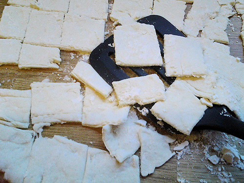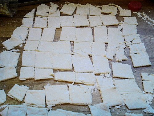 Mmmmm can you smell that chicken broth. Let’s cut this dough! Cut into small squares using a flat knife in about 1×1 if you want to be technical. Please don’t measure them and if you are stop reading my blog right now you will get disgusted with me very quickly, I am no where near that technical. Hehe.