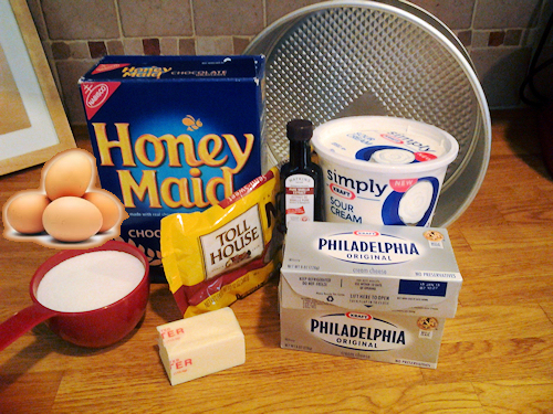 Note: You will want to set out the cold ingredients at least an hour before you get started. I leave out the cream cheese, sour cream and butter and eggs.