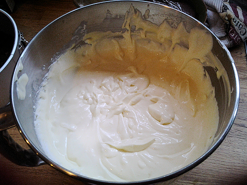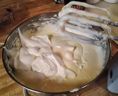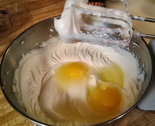 Then add each egg one by one or two by two until it is blended well. When all ingredients are blended, stop the mixer and add the sour cream. Return mixer to low to fold in the sour cream and you’re done! Do not over mix.