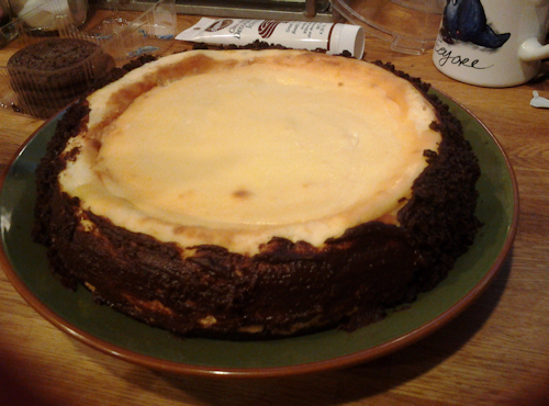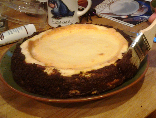 SO this where we melt that chocolate and use the crumbled cookies. Pour 1/2 the chocolate chips into a glass bowl and microwave for 30 second intervals stirring between each until nicely melted. I used a pastry brush and brushed the sides of the cheesecake a little at a time and then pressed the cookie crumbles against it. The chocolate will harden and it will gold nicely. Do this all around the cake until done.