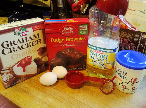 - 1 box of fudge brownies (we like the Betty Crocker brand) and you will follow the normal directions on your brownie box. For this one it is as follows: