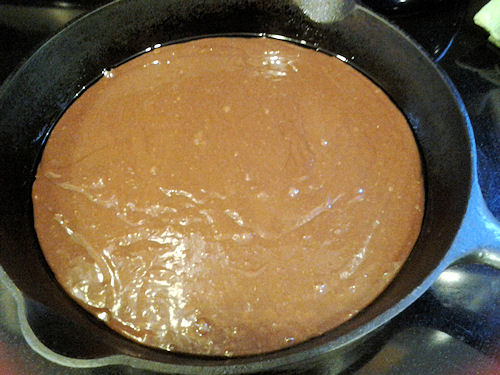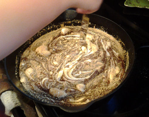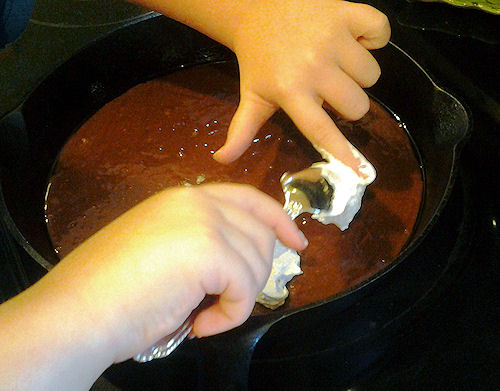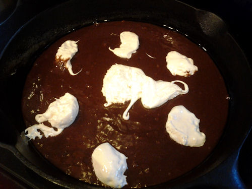Add your brownie mixture into your favorite brownie pan. I love using my cast iron pan because it makes the edges nice and chewy. Now it begins to get fun. Open that marshmallow and lets get out one teaspoon and start dropping it into that pan.