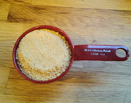 Once you get your pan sufficiently dotted, measure out one cup of the graham cracker crumbs.