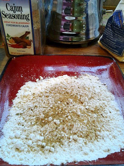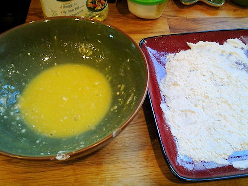 First thing is lay your fish out then add your flour and seasoning onto a nice sized plate for flouring. Now if you like a little heavier seasoning go for it!! You know your palét. Beside your plate place your bowl or pie plate with the beaten egg. I like to sprinkle some seasoning in this as well for a double shot.