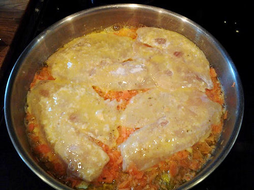 Let them simmer on a low heat to soften. 3 minutes would be sufficient. Next you want to dredge the fish into your egg then flour mixture not a fan of the opposite way. Set each piece of fish onto the sweet potatoes. Repeat with each piece of fish. Cook for about 5 more minutes, lift fish up and flip kind of cutting around the fish like a cut out per-say and flip over. I only crusted one side of this fish with the sweet potato. I thought the double side was too much but if you would prefer it that way this is how: While holding the fish on the spatula, add another thin layer of the shredded sweet potatoes to the pan. Lay the fish onto the those sweet potatoes. Allow to simmer for another 5 minutes.