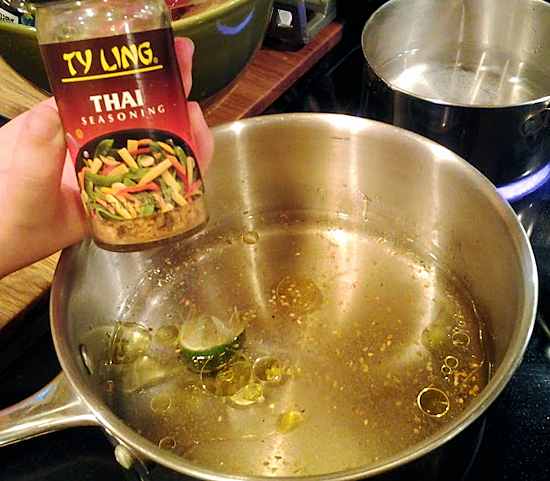 While this is going let’s start out rice water. In the water I added 1 heaping table-spoon of Thai seasoning. 1 Tbs of olive oil and 1 squeezed lime wedge and threw the lime right in the water. (Now let me say if you don’t have Thai seasoning use any Asian seasoning or even 2 TBS of soy sauce and maybe some ginger fresh or a tsp of powder just something to take that Spanish edge off the rice 🙂 Let that water come to a boil, add rice turn down to a low simmer (3) and cover for about 20-25min.