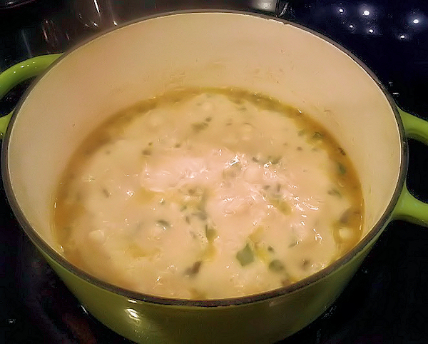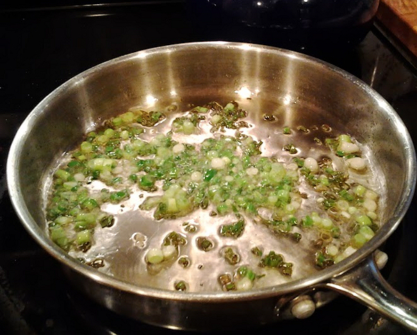 In a nice size sauce pan or a nice non stick LARGE sauce pot add 2 Tbs olive oil and the chopped green onions. Let sizzle till they almost look fried.