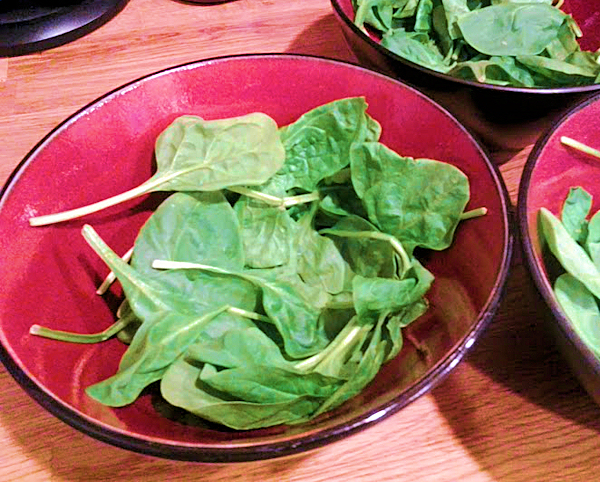 While this is going on let’s get our bowls ready. Line each bowl with some fresh spinach. Like so….