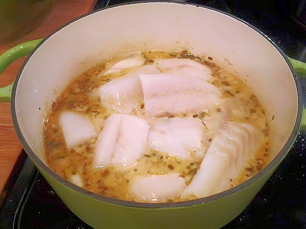 Lay each piece right into the broth and let it simmer for about 5 mintues then start ladling the broth over top the fish coating each piece and let simmer another 5 minutes and your fish should be done.