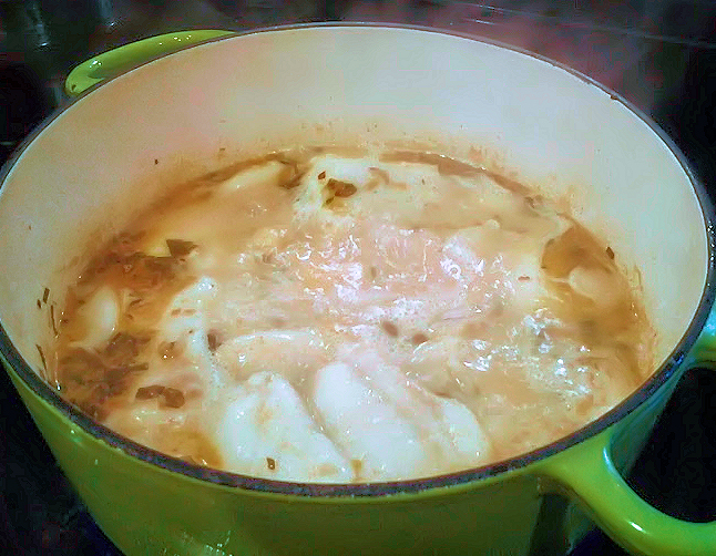 Back to the onions, we are now ready to add our broth, coconut milk, squeeze the rest of the lime juice, fish sauce and red curry add your Red curry a 1/2 tsp at a time!! Let this come to a rolling boil then turn down to simmer.
