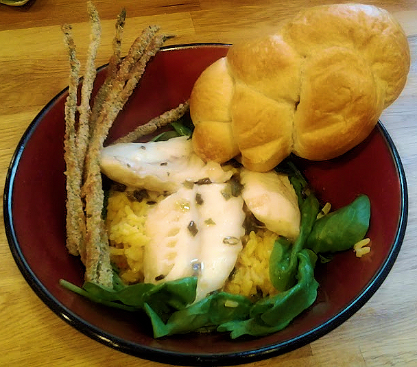I of course had to make bread for some of the men in the family and of course my daughter and it was wonderful for dipping I am told! I made this dish with some Parmesan crusted asparagus which you can find here and for myself I made some red lentils instead of rice but of course that is up to you. Yum! Hope you enjoy.