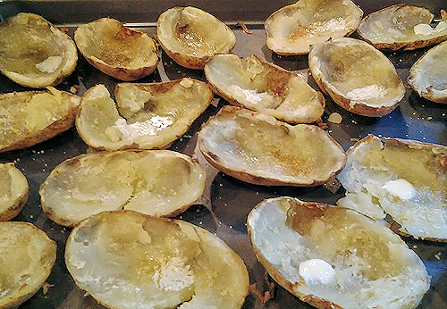 When cooled take each one and slice in half and scoop put the center with a small spoon. Leaving the base in tact with some potato.