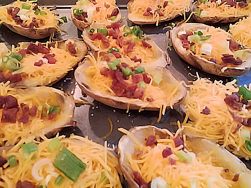 cheese and bacon, food, green onion, loaded baked potato skins, potato skins, shredded cheddar cheese