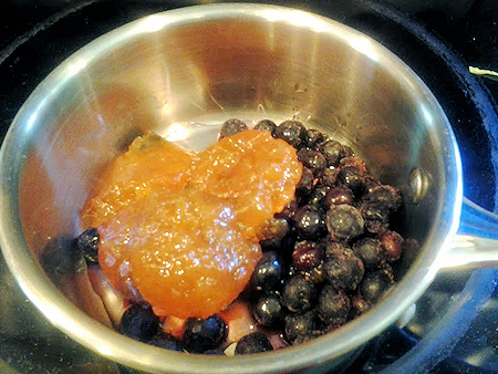 Next I started my sauce. I added the peach preserves and blueberries to a sauce pot and simmered.