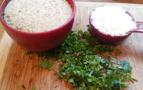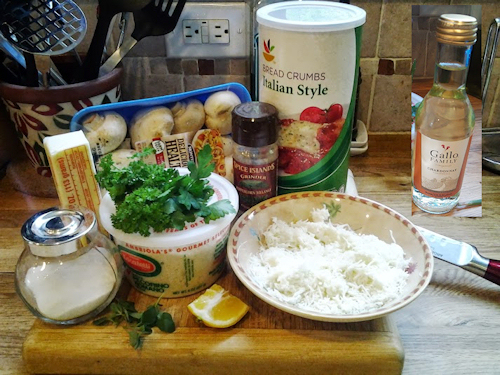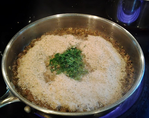 Let that simmer until the mushrooms look a little translucent. When that happens, it is time to add your breadcrumbs, Parmesan cheese, sprinkle of salt, pepper, parsley and the oregano. Hold out on the Mozzarella.