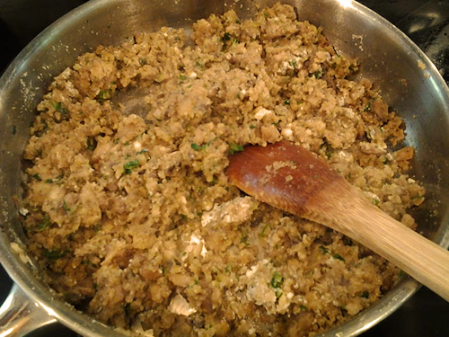 Incorporate it all together, add wine (*or vegetable stock) and water. It will be thick like stuffing, but if it’s too crumbly, add more stock or water.