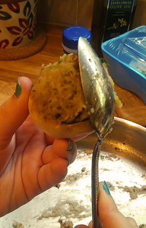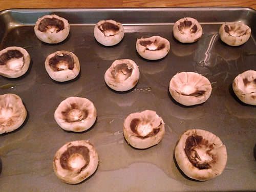When you have them all hollowed out, start placing on an oiled sheet pan and set aside.