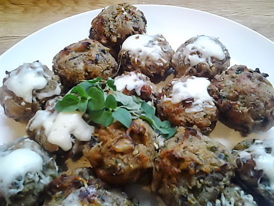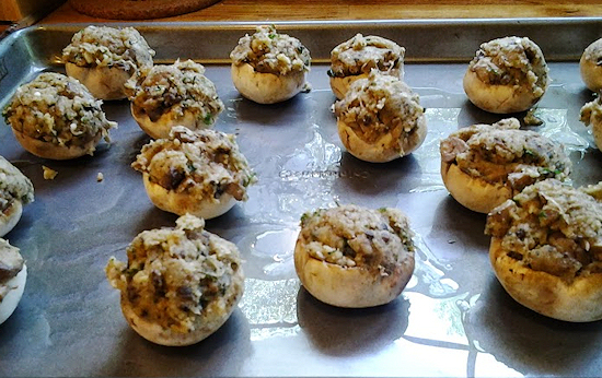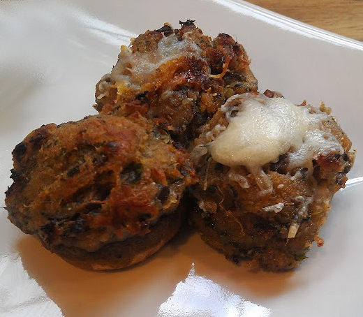 At the very end put in 1/4 cup of the mozzarella and stir. Save 1/4 cup for the tops of half of the mushrooms. Now comes the easy part; let’s stuff those caps! Take each cap and scoop about a tablespoon into each. Make a nice rounded top, no need to make them even with the cap they will not overflow onto the pan. See below: