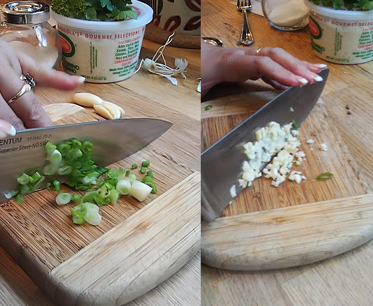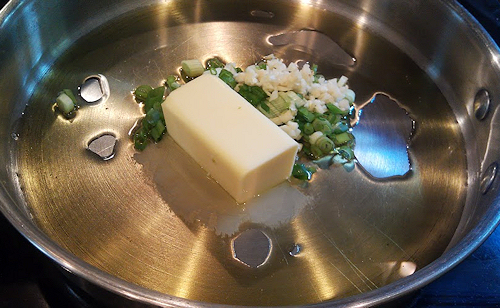 Chop your onion and garlic and in a large sauce pan add in 3 tbs of olive oil and butter. Let the pan get hot. Add in onions and garlic.