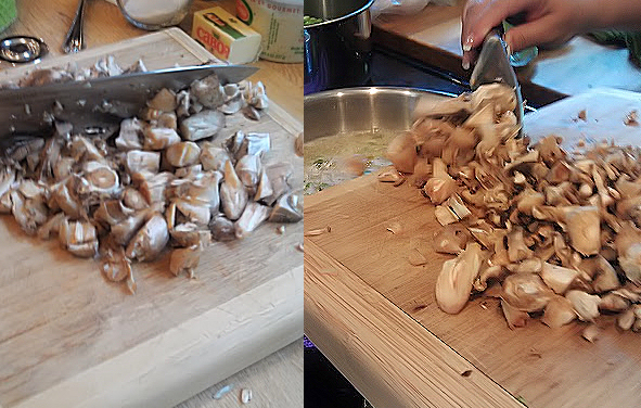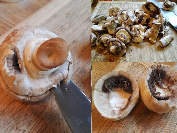 With that melting, prepare your mushrooms. Wash, wipe and clean them. Then take each one and carefully circle around the bottom making a nice hole to put stuffing in. Keep all the stems!! We will be using them next. See below: