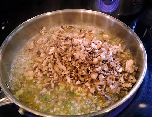 Chop up the stems from the mushrooms(just a rough chop, it does not have to be perfect) and add to the pan with the onions and garlic.