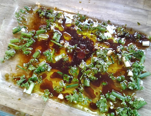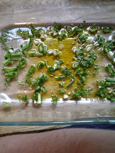 In a 9×13 baking dish, add your wet ingredients with the parsley, garlic and onion.