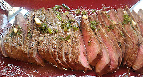 I love steak, yes I do! That’s the only thing that’s keeping me from being a full on vegetarian. Alas, steak always gets in the way. I love it covered, smothered, sliced, diced or just plain in all it’s glory. I had to laugh when the doctor told me my iron was low because it was not for lack of red meat! London Broil is one of my favorite cuts as it is so versatile. You can cut this for dinner, or for sandwiches and use it in tacos. You name it, this cut can do it. Tonight, I used a marinade and my chimichurri sauce. This sauce took it over the top but the marinade was spot on so fire up the grill!