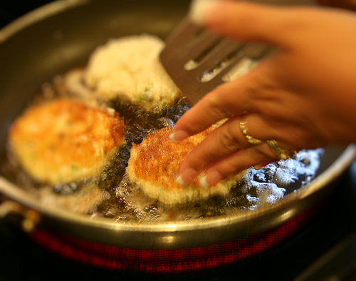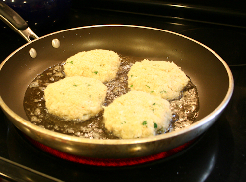 In a nice size pan add your oil and heat on medium high. When the oil is hot, place your cakes in. I did four at a time. This mix made 7 nice size cakes.