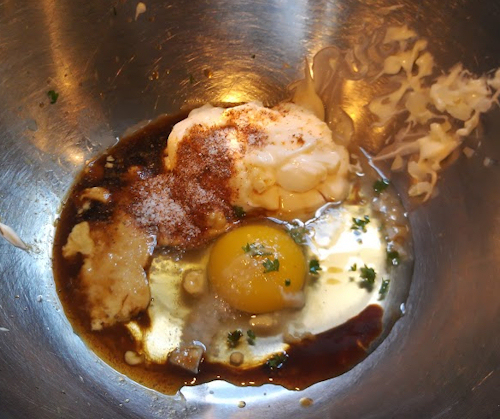 In a large bowl, combine the egg, dijon mustard, mayo, lemon juice, Worcestershire sauce and the seasonings.
