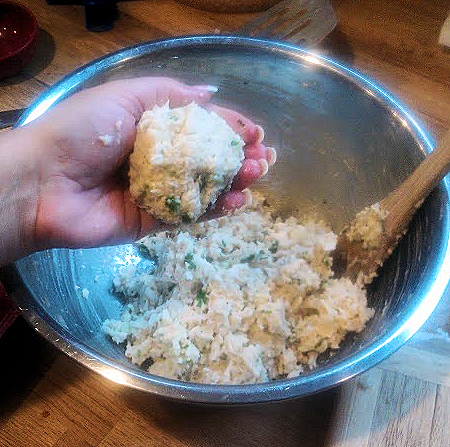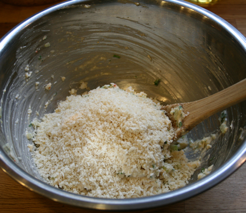 Now comes the fun part. On a separate plate, sprinkle some of the panko crumbs on the plate so we can coat the cakes. Take a small handful, about 1/2 cup or so and make a nice little ball.
