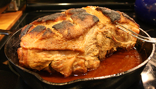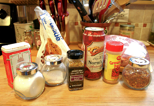 Place the rubbed pork in a roasting pan and pour the beer into the pan. Do not pour onto the the meat, pour into the sides of the pan.
