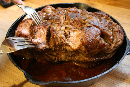 There it is, resting. I let mine rest for about 15min when I bring it in from the grill or take it out of the oven. You will need two forks to pull the meat off and just start scraping it off. It should be very tender at this point and very easy to do.