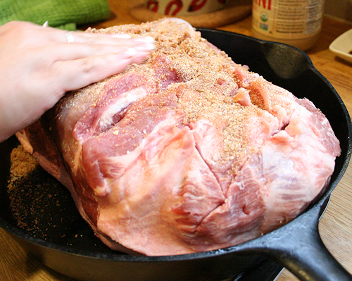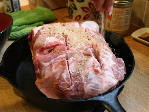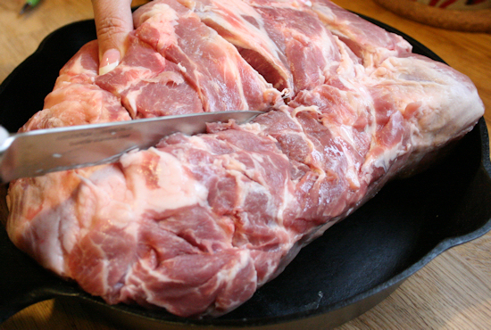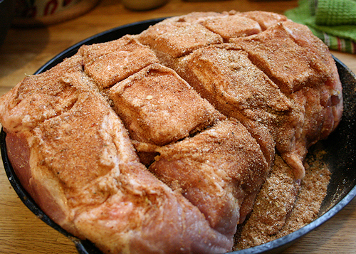 Next, turn over the roast and repeat. Score the meat, sprinkle and massage the remainder of the spice rub.